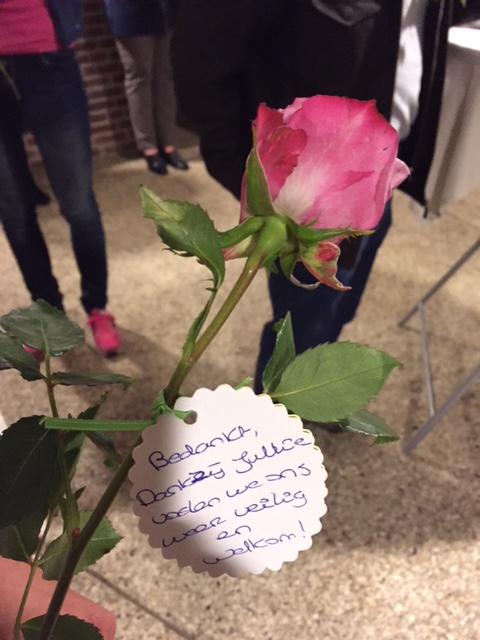 Vlak voor de vergadering begon, werden we ‘overvallen’ door de vluchtelingen. Ze hadden de hele stad rondgespeurd om mooie, betaalbare rozen voor ons allemaal te kopen. Een Nederlandse vrijwilligerster uit een eerdere opvangplaats had hen geholpen een liefdevolle tekst te schrijven. De meesten van ons (ik ook) bedankten de vluchtelingen met een Hollandse drieslag (zoenen) of bij de heren met een stevige hug. Een gebaar dat naderhand verwarring opriep bij me: was dit cultureel gezien wel aanvaardbaar geweest?